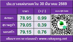 ตลาดกลางประมูลยางหาดใหญ่ (สงขลา) 78.95 บาท/กก.  ราคาเพิ่มขึ้น  https://rakayang.net/vip/view.php?idr=31475