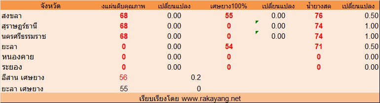 จังหวัด สงขลา ยางแผ่นดิบคุณภาพ 3  = 68บาท/กก. ราคาไม่เปลี่ยนแปลง เศษยาง 55บาท/กก. ราคาไม่เปลี่ยนแปลง  บาท/กก. น้ำยางสด ราคา ณ โรงงาน 76บาท/กก. ราคาเพิ่มขึ้น 0.50บาท
