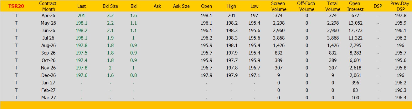 ราคายางTSR20 ตลาดยางSICOM ราคาส่งมอบเดือน เม.ย.ปิดที่201 เซนต์สหรัฐ ราคาเพิ่มขึ้น 3.2 เซนต์สหรัฐหรือ คิดเป็นเปอร์เซนต์ +1.62% %