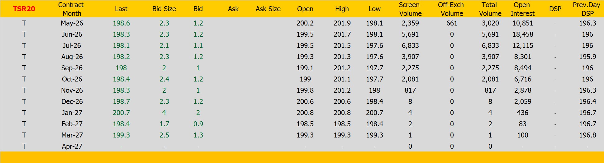 ราคายางTSR20 ตลาดยางSICOM ราคาส่งมอบเดือน เม.ย.ปิดที่198.6 เซนต์สหรัฐ  ราคาเพิ่มขึ้น 2.3 เซนต์สหรัฐหรือ คิดเป็นเปอร์เซนต์ +1.17% %