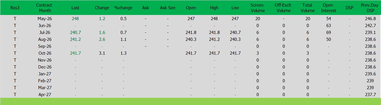 ราคาปิดตลาดยาง SICOMประจำวัน พฤหัสฯ ที่ 2เมษายน2569ราคายาง RSS3 ราคาเดือนพ.ค. ราคาเพิ่มขึ้น 1.2เซนต์สหรัฐ ปิดที่ 248 เซนต์สหรัฐ