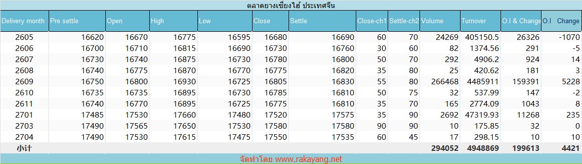 ราคาปิดตลาด(Close)ยางเซี่ยงไฮ้ประเทศจีน(SHFE)ประจำวัน พฤหัสฯ ที่ 16 เมษายน 2569ก.ย.-2026 ราคาเพิ่มขึ้น 55หยวนปิดที่ราคา(close) 16,805 หยวน/ตัน ปริมาณ266,468 สัญญา